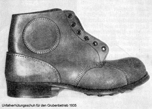 Aber nicht nur die Technik macht Fortschritte, sondern es beschäftigen sich auch immer mehr Firmen mit der Entwicklung von Produkten, die der Arbeitssicherheit dienen. Als 1936 Unfallverhütungsschuhe und Lederhelme auf dem Markt erscheinen, kauft die Zeche diese Artikel in größeren Mengen ein und gibt sie verbilligt an die Belegschaft weiter, um Dachschuhe und Schlapphüte aus der Grube zu verbannen.