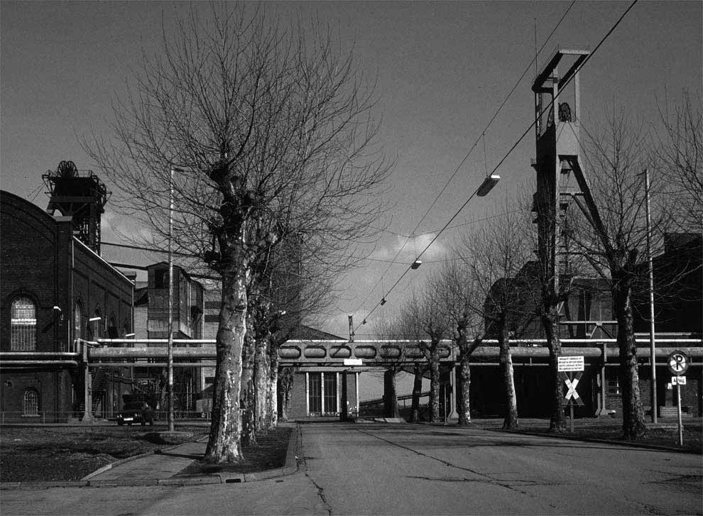 Das Fördergerüst rechts steht über dem Schacht Prosper 6. Die Zeche lag an der Rheinstahlstraße in Bottrop. Nur die beiden Torhäuser sind erhalten. Auf einem Teil des Geländes stehen Wohnhäuser, auf dem Rest ist eine Parkanlage entstanden.