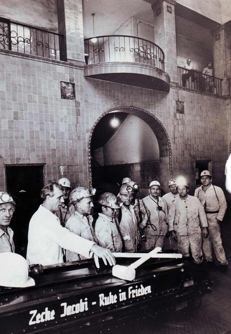 "Der letzte Förderwagen rollte am Samstagvormittag auf die Hängebank im Schacht II der Schachtanlage, die, wie bereits mehrfach angekündigt, im Rahmen des Gasamtanpassungsplanes der Ruhrkohle und der Bemühungen der Bergbau AG Oberhausen, die Förderung auf die ergiebigeren nördlichen Grubenfelder zu verlagern, stillgelegt wurde. Auf Einladung der BAO (Anmerkung: Bergbau AG Oberhausen) erlebten zahlreiche Berginvaliden und noch aktive Kumpel das traurige Ereignis bei Dosenbier und Erbsensuppe. Nicht wenige Jacobi Kumpel hatten Frau und Kinder mitgebracht.