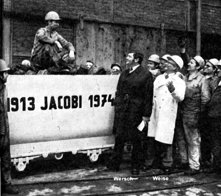 Am Freitag, dem 29. März 1974, verfährt die verbliebene Jacobi-Belegschaft ihre letzte Schicht in der gewohnten Umgebung. Bekanntlich hängen die meisten Kumpel trotz der nicht immer angenehmen Erlebnisse an "ihrem" Pütt.
